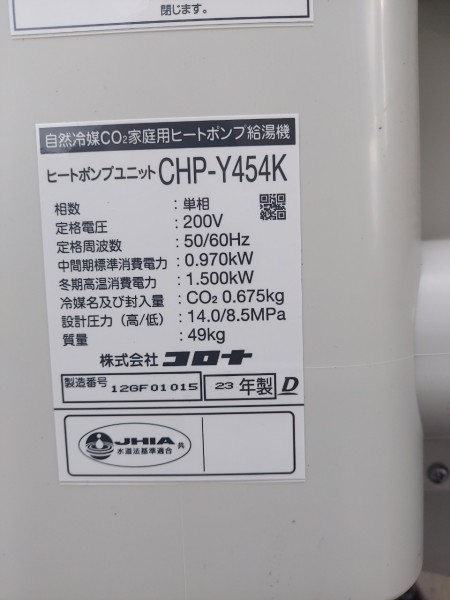 福岡市早良区 コロナ自然冷媒CO2家庭用ヒートポンプ給湯機ヒートポンプユニットCHP-Y454K、貯湯ユニットCTU-37AY5K エコキュート交換工事
