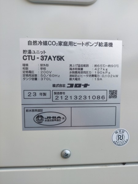 福岡市早良区 東芝エコキュート→コロナ自然冷媒CO2家庭用ヒートポンプ給湯機ヒートポンプユニットCHP-Y454K、貯湯ユニットCTU-37AY5K エコキュート交換工事