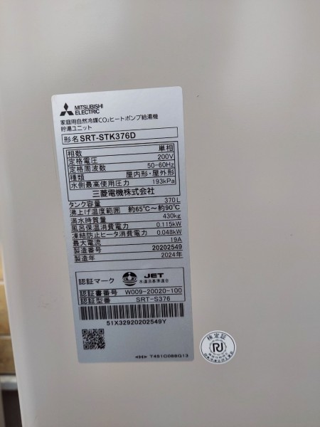 筑前町高田 三菱電機自然冷媒CO2家庭用ヒートポンプ給湯機貯湯ユニットSRT-STK376D、ヒートポンプユニット エコキュート交換工事