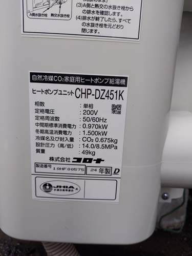 宇美町井野 コロナエコキュート→コロナ自然冷媒CO2家庭用ヒートポンプ給湯機 ヒートポンプユニットCHP-DZ451K エコキュート交換工事