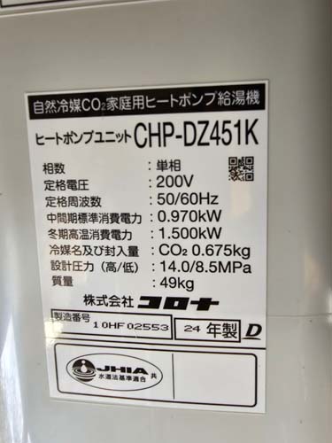 福岡市南区 コロナ自然冷媒CO2家庭用ヒートポンプ給湯機 ヒートポンプユニットCHP-DZ451K エコキュート交換工事