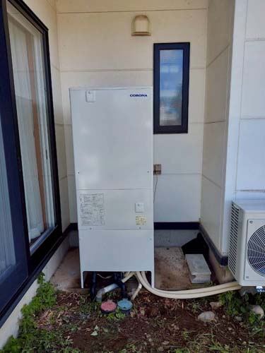 トップページ > 工事事例一覧 > 宗像市野坂 コロナ自然冷媒CO2家庭用ヒートポンプ給湯機 ヒートポンプユニットCHP-DZ601K、貯湯ユニットCTU-46AZ1K エコキュート交換工事